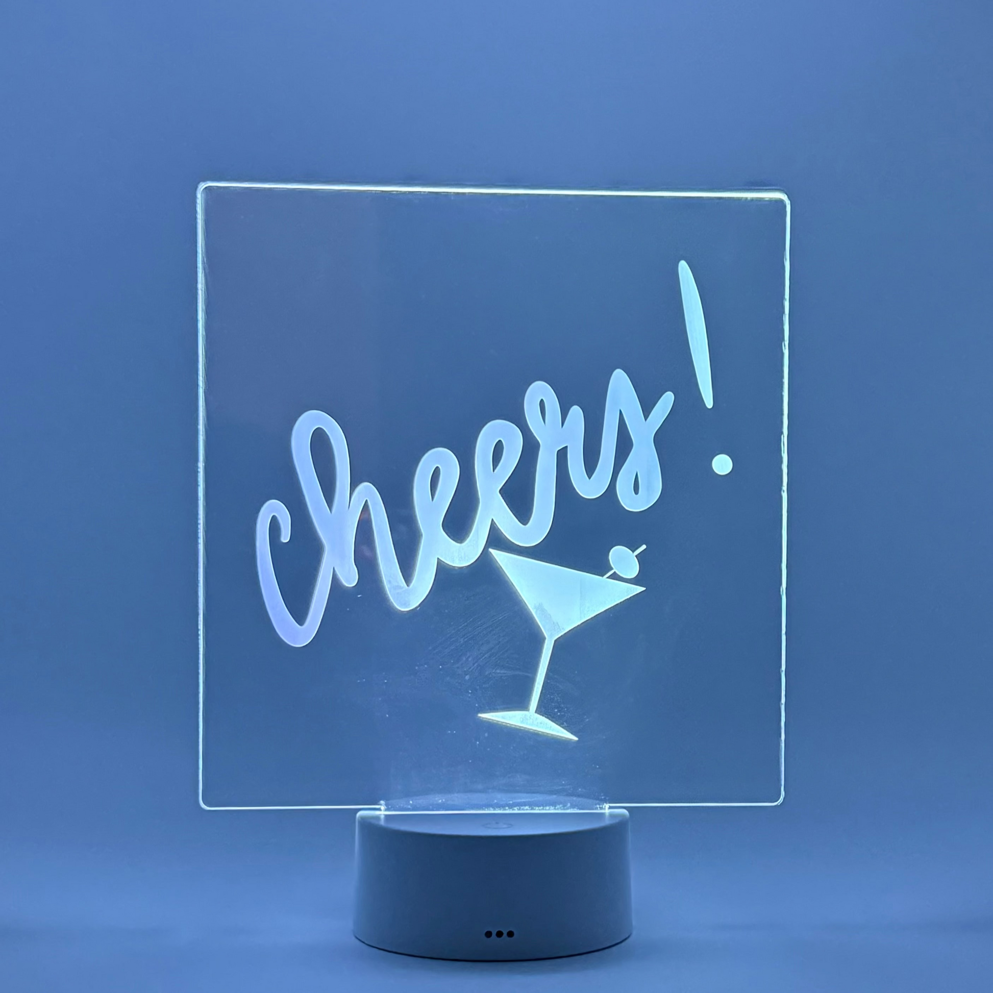 Includes the word "Cheers" in elegant cursive with a glowing martini glass illustration. No customization required. Just plug it in and enjoy the vibe.
