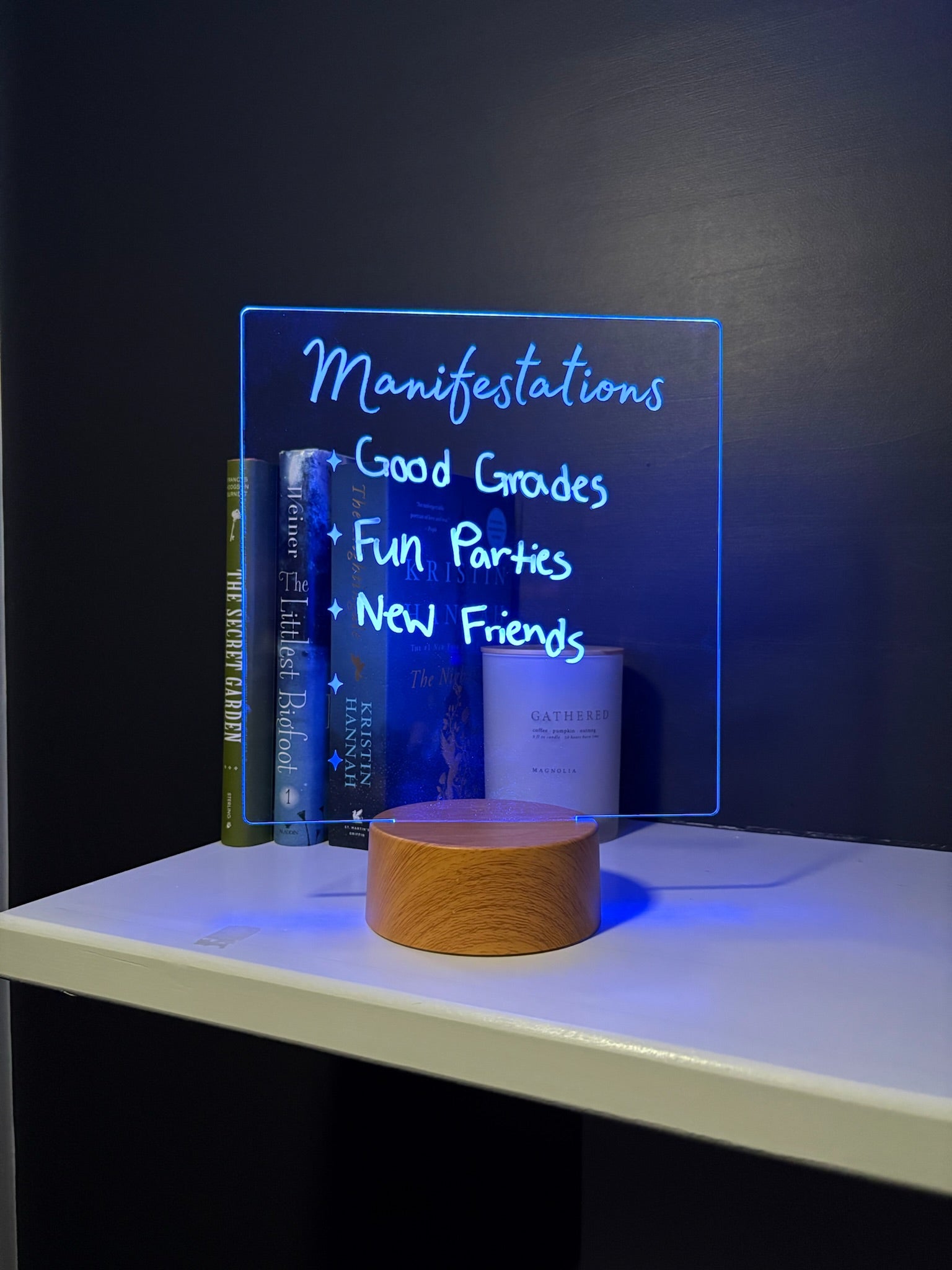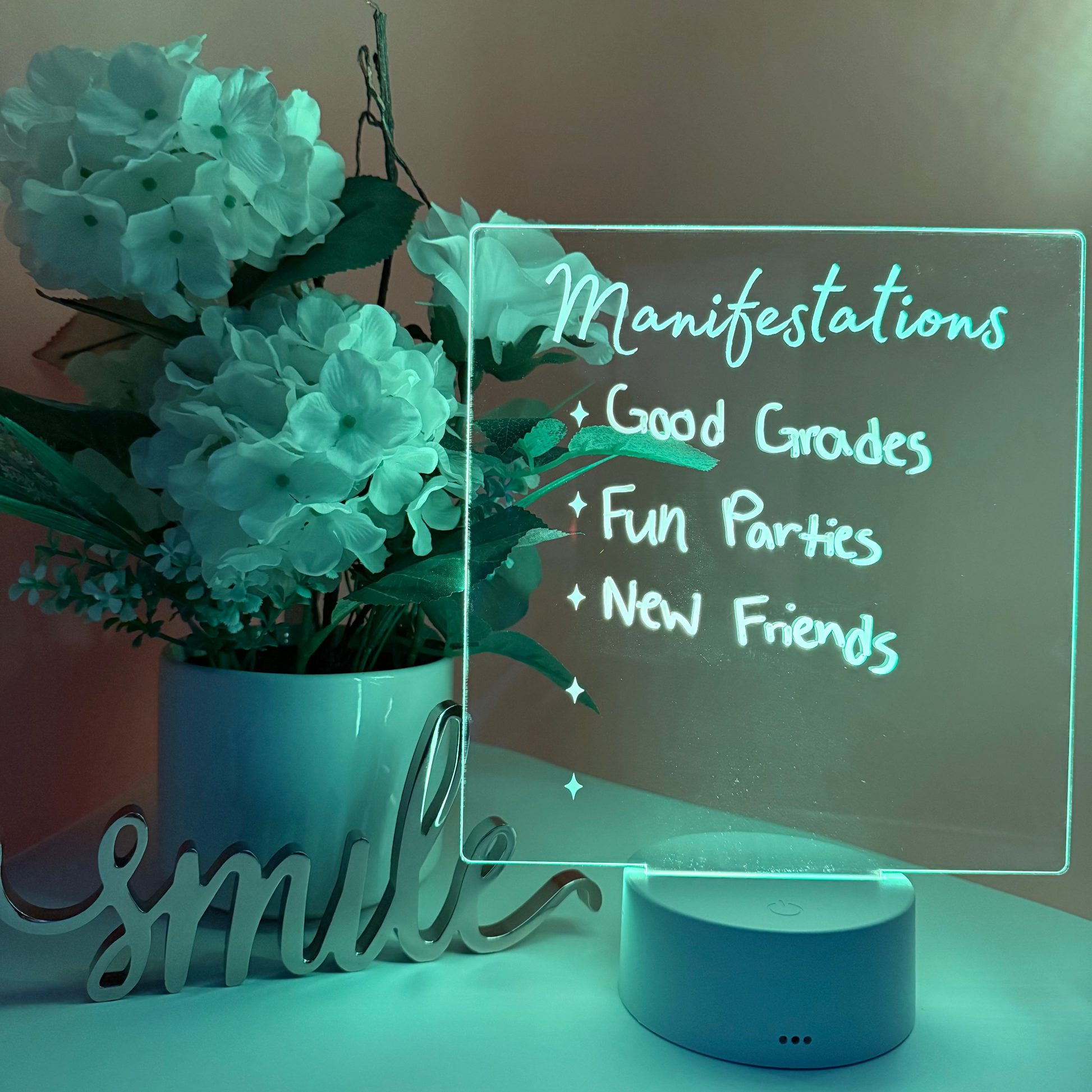 Put your goals in writing and let them shine. Manifestations is a glowing acrylic board with the word "Manifestations" etched across the top and a row of star bullet points underneath. It is ready for your daily intentions, dreams, and affirmations.